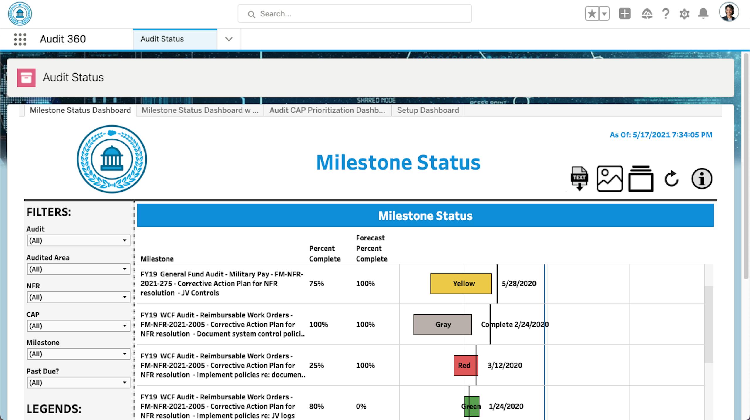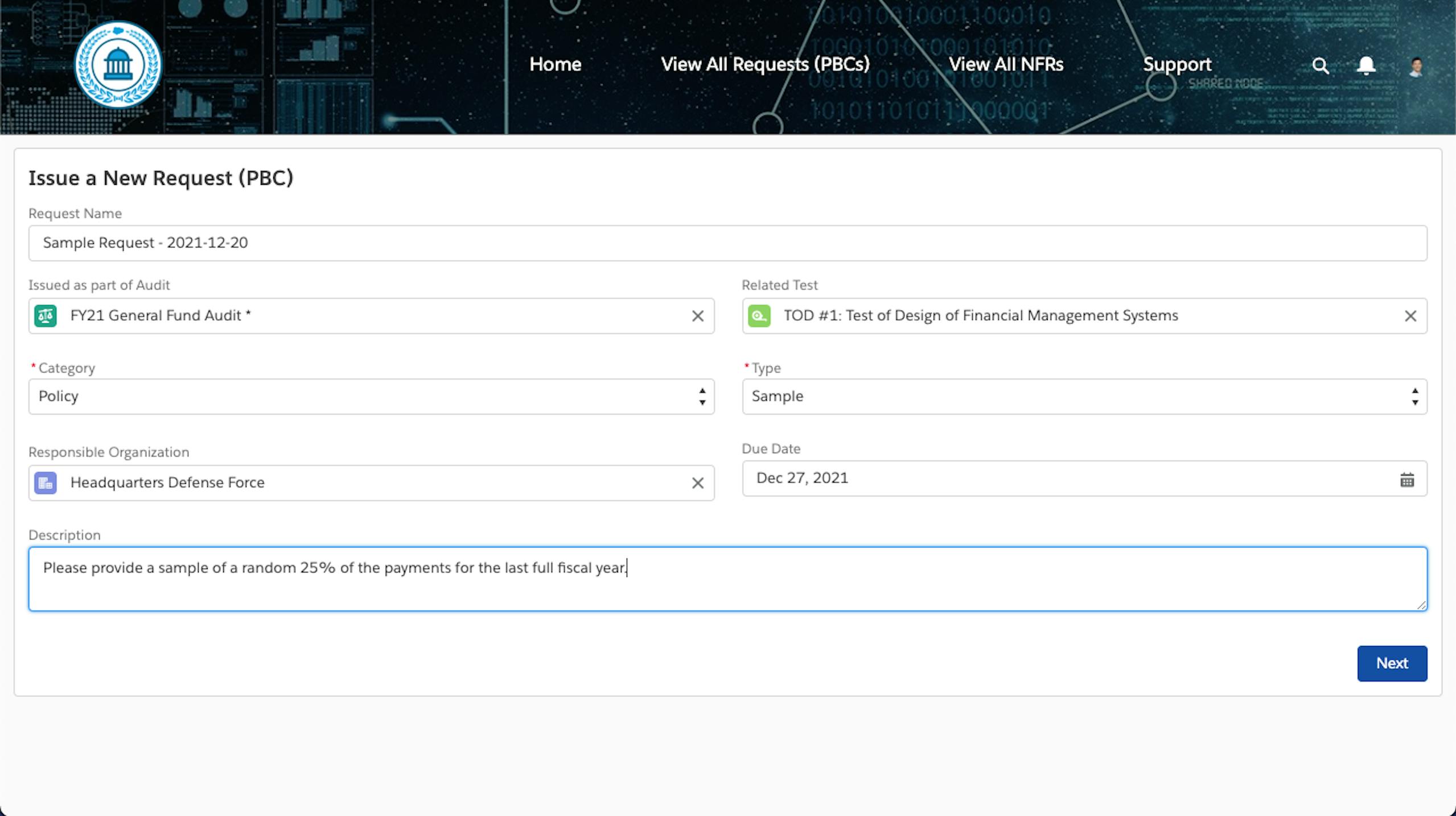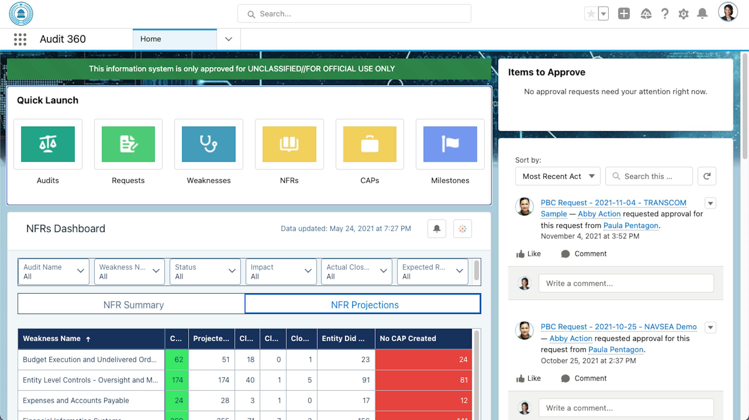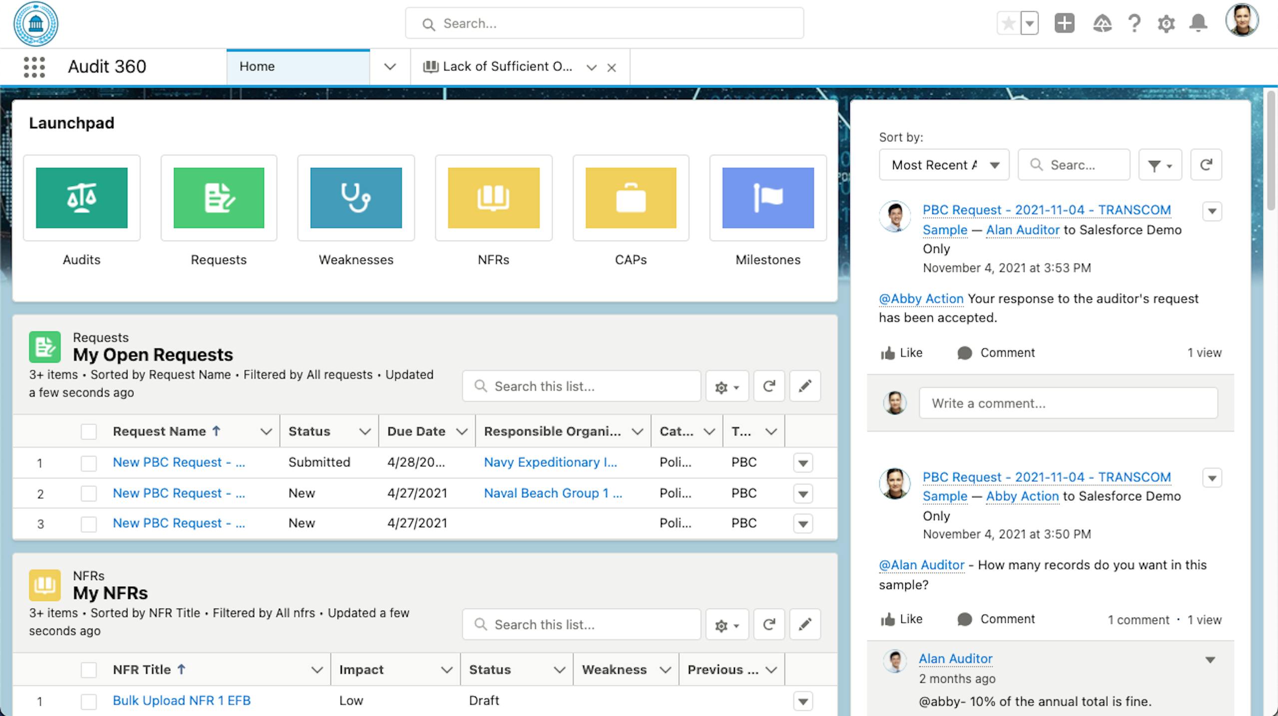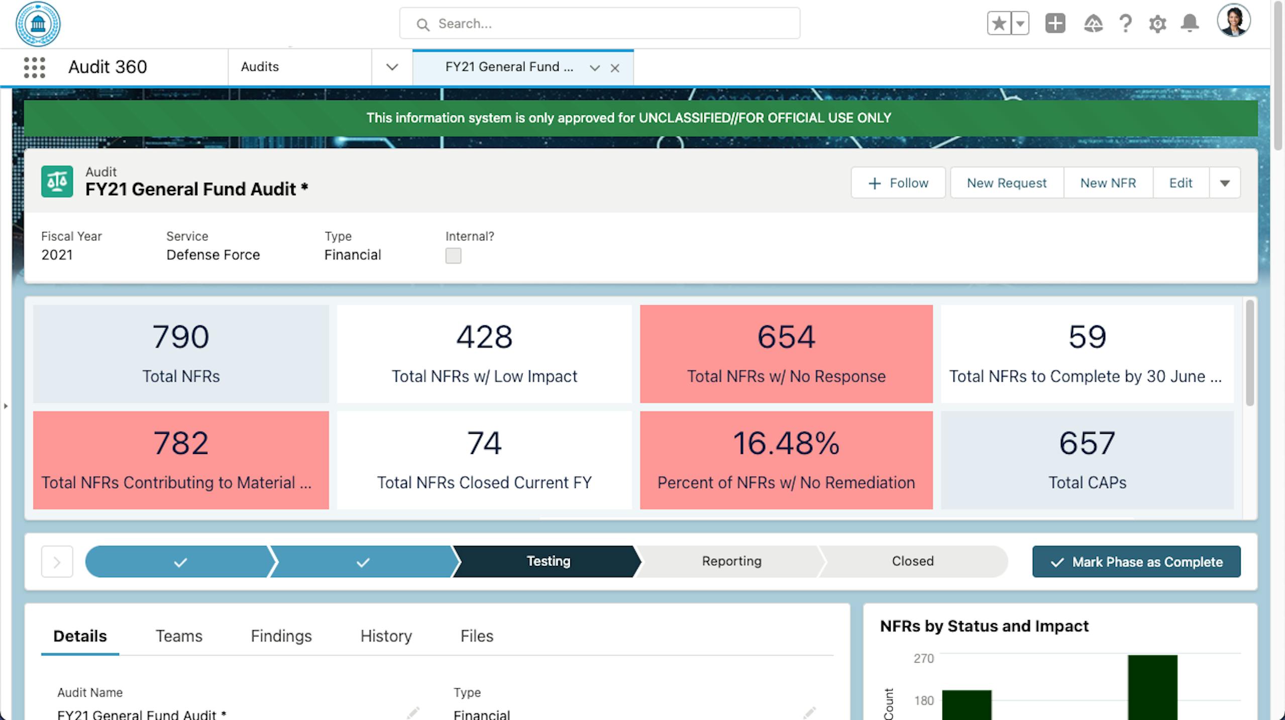 Organizations must regularly perform system and procedural audits. The process of running an audit involves multiple stakeholders, determinations, and outcomes. Having one system to track all work efforts makes it easy for all stakeholders to work from a common operating picture. Providing a modern, tailored user experience for everyone involved promotes adoption and produces actionable data for every stakeholder.
