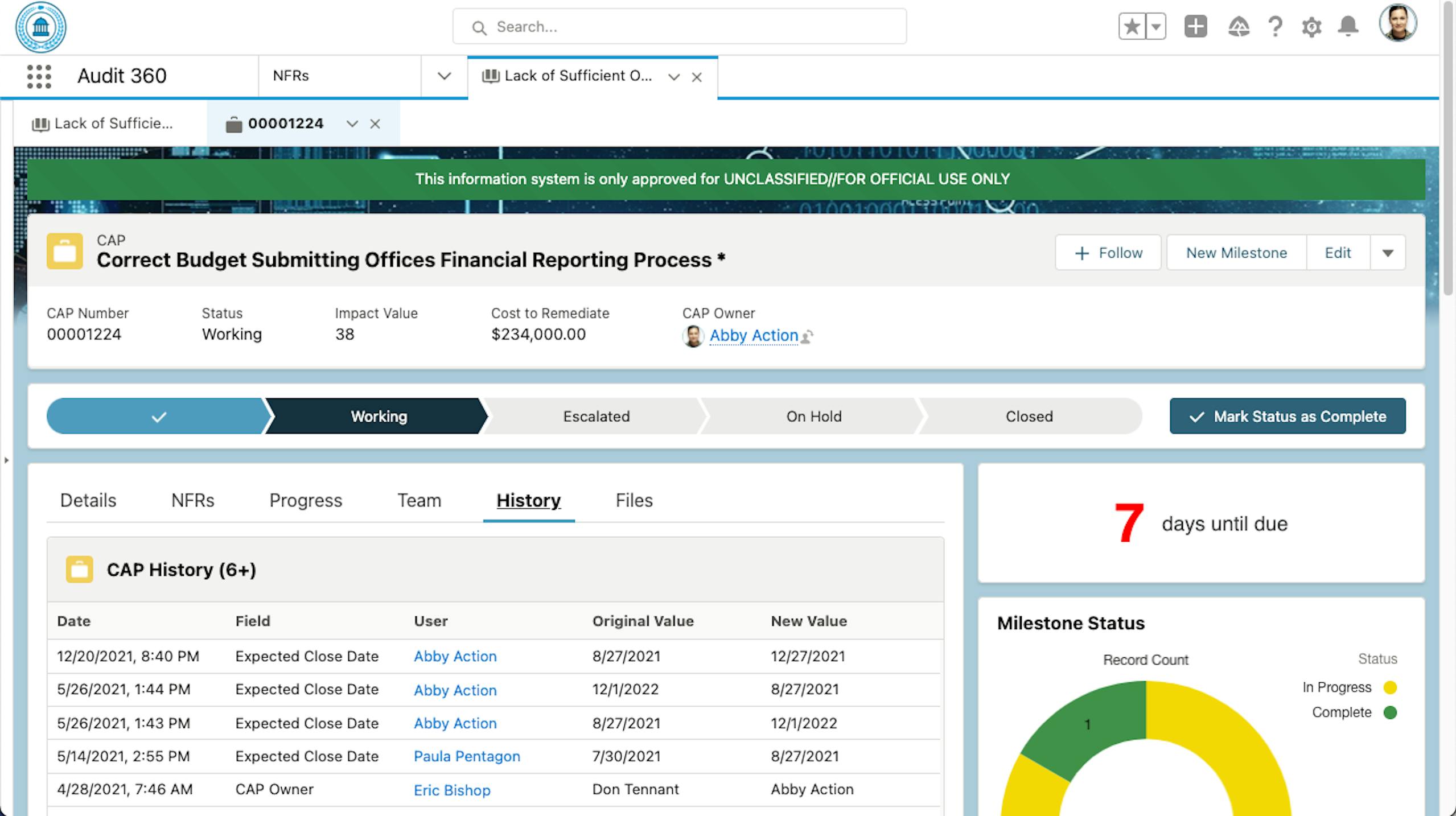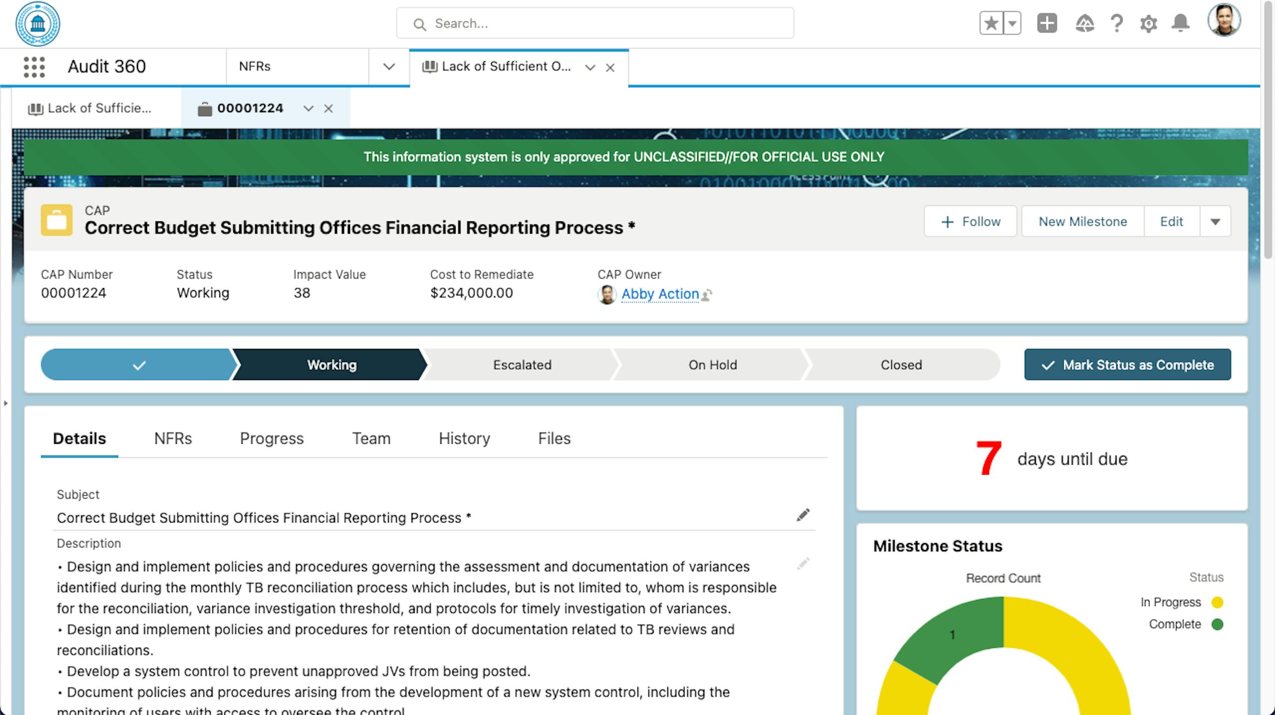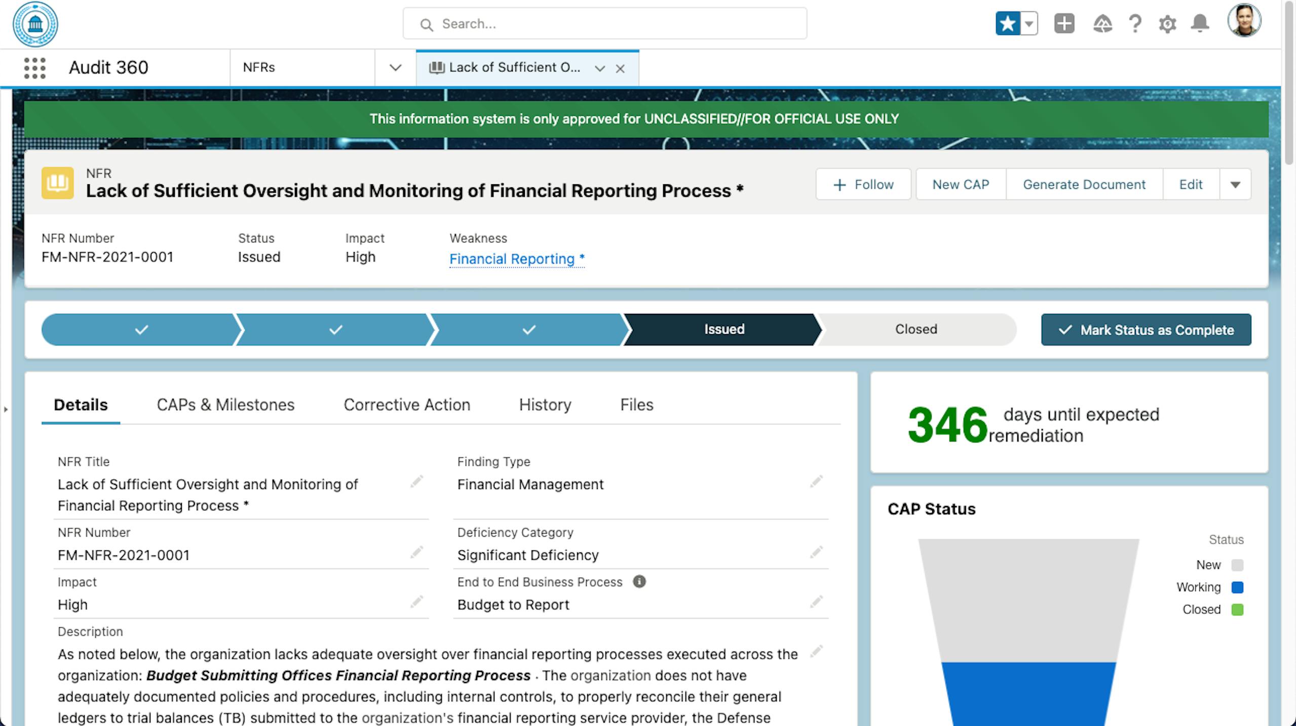 Knowing and understanding risks are only one part of the overall solution; action Officers can also create one or multiple CAPs (Corrective Action Plans) to remediate NFRs. A specific CAP can also support the remediation of multiple NFRs. All aspects of the CAP can be recorded throughout the plan’s execution.