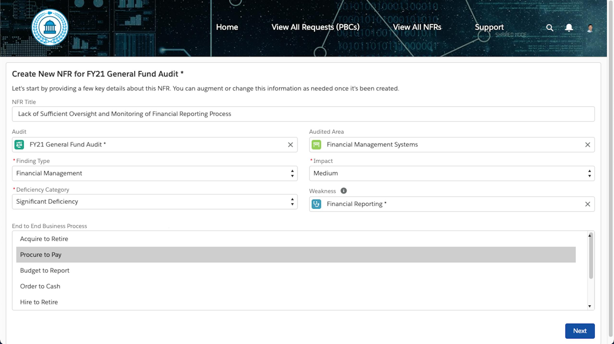 Internal Action Officers can review NFRs submitted by Auditors and collaborate with internal and external stakeholders during the lifecycle of the NFR: from initial proposal and submission to final remediation and closure, using built-in email and on-platform conversation and notification capabilities. The system tracks all efforts made to remediate the NFR throughout the process.