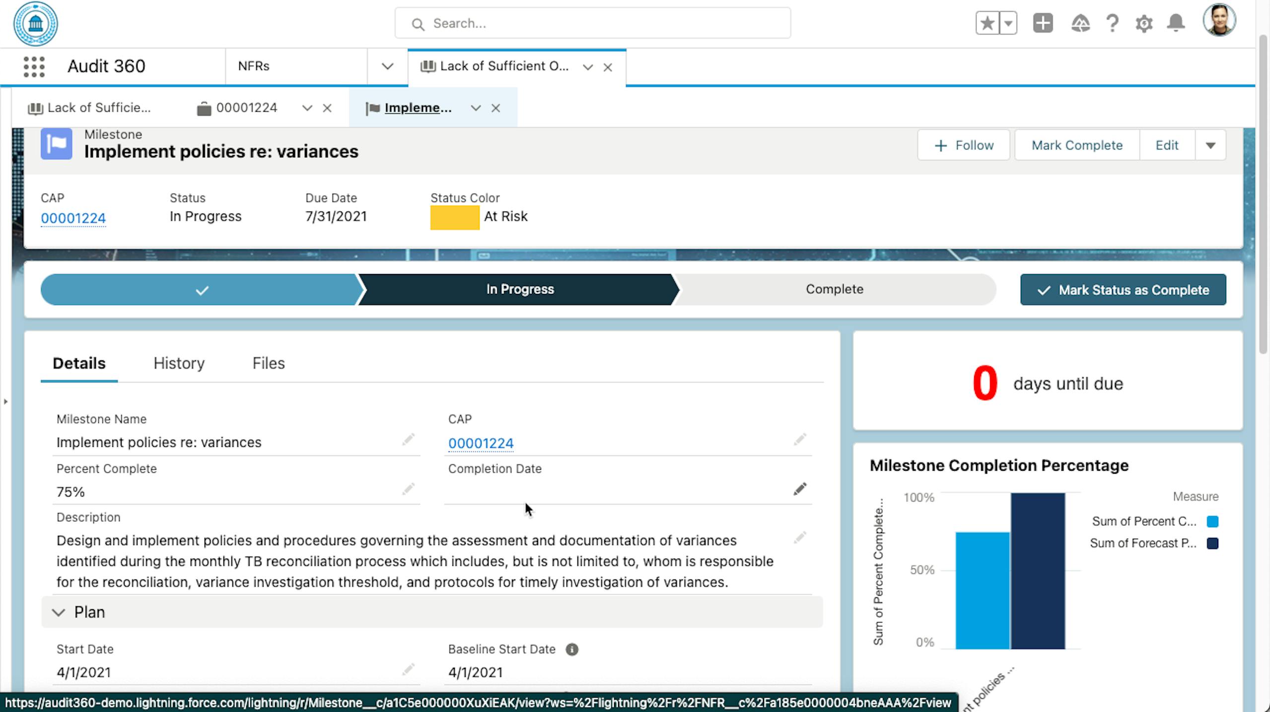 Individual Milestones associated with Corrective Action Plans are tracked with progress, expected completion, responsible personnel, and other fields to provide visibility at the finest granularity. Milestones can capture assets and deliverables generated to complete the Milestone.
