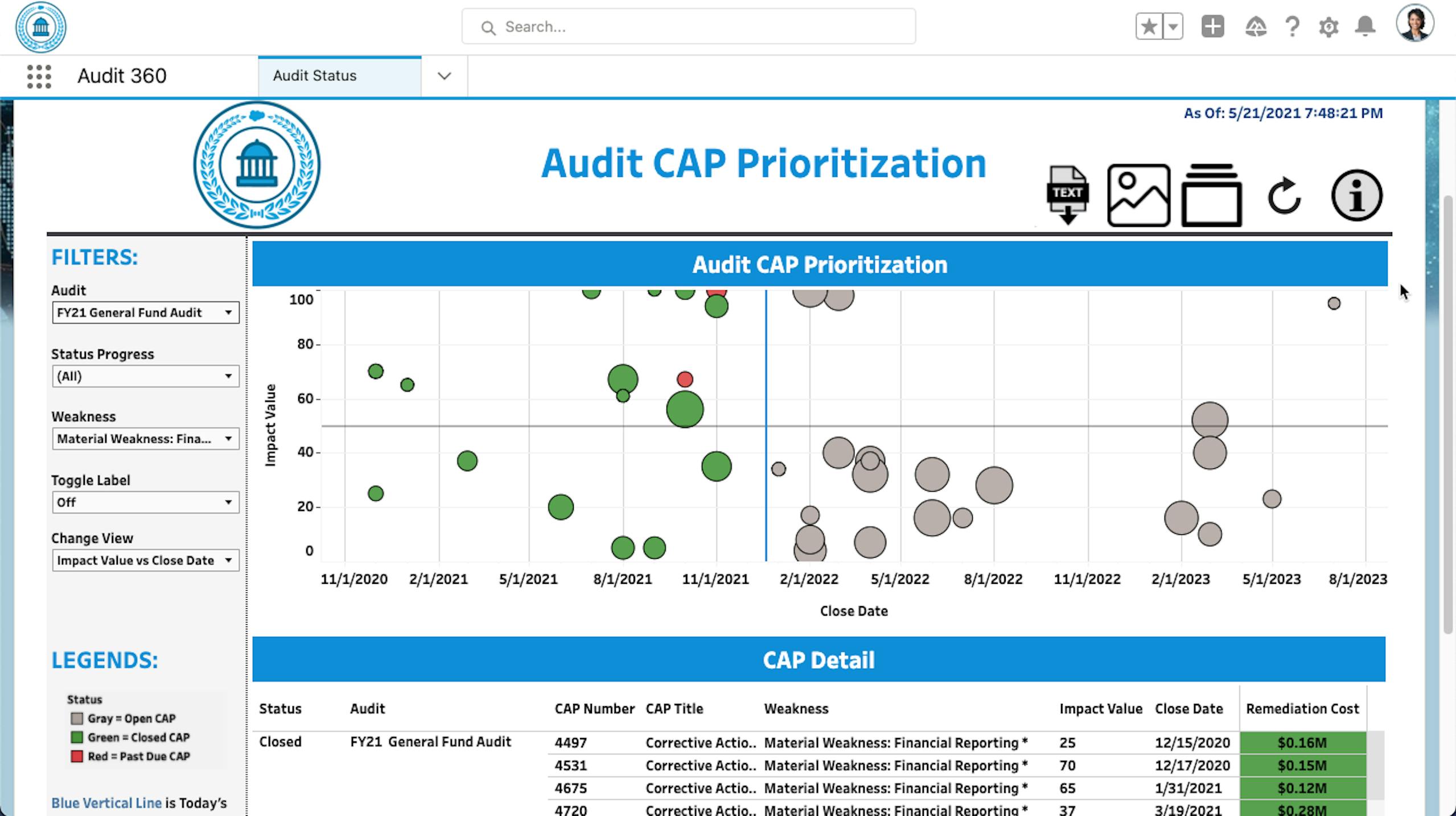 With a common operating picture, leadership can use the information in the Audit Management system to strategically prioritize remediation actions. Data naturally captured during the Audit Process can be used to create visualizations of cost and impacts to focus remediation efforts.