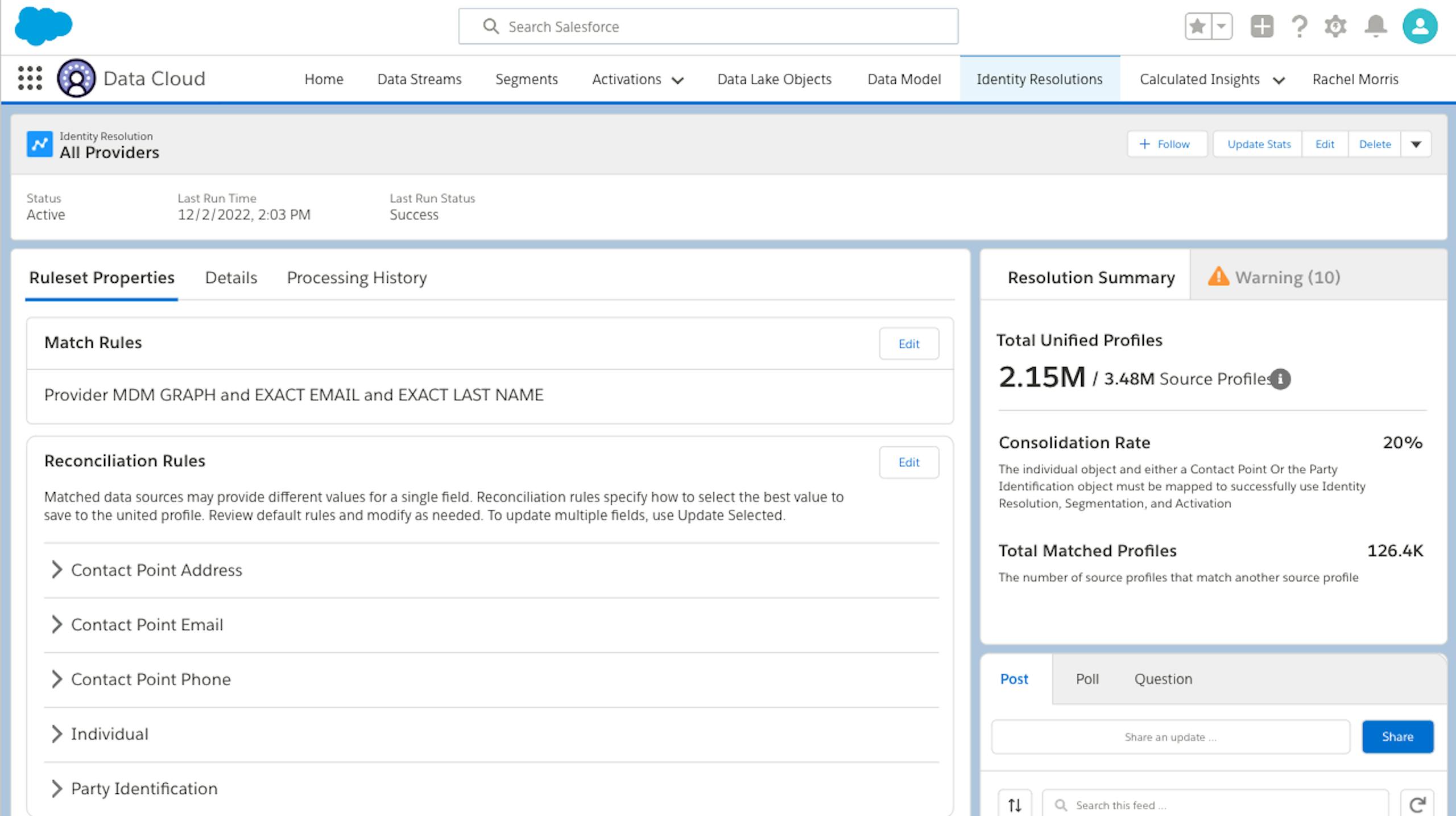 Now that all of this data is ingested and mapped, it’s time to create a single profile based on easily configurable identity resolution rules. Identity resolution uses rules and algorithms to reconcile data about people or accounts and resolve them into a single identity, a unified profile.