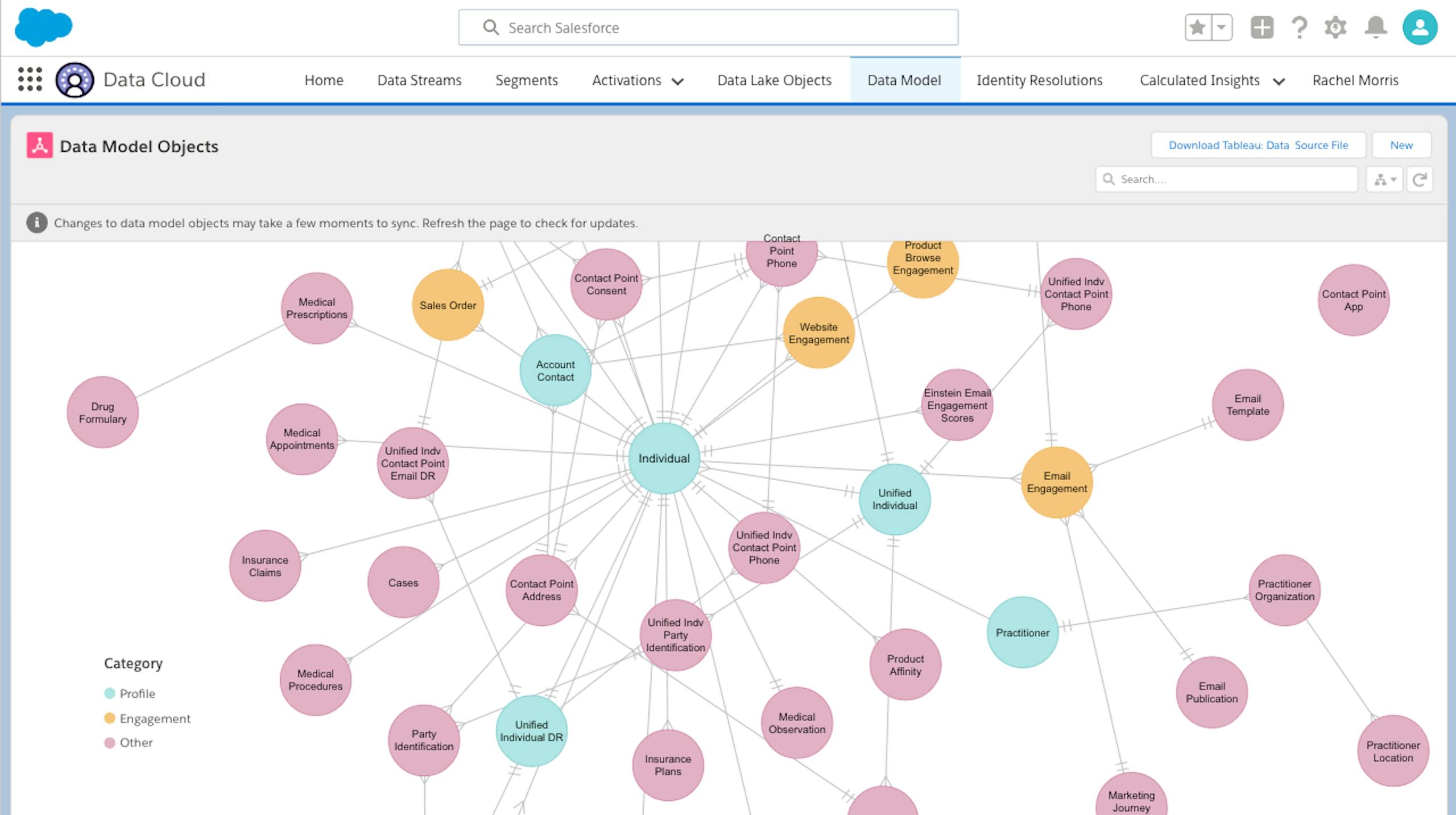 Once data is ingested from various sources, it can be made sense of by mapping it to a data model. Data Cloud uses a data model centered around the individual that can be extended to meet your specific organizational needs. The user interface provides the ability to drag source columns to the corresponding destination column in the data model. Data Cloud makes what is normally a complicated data engineering task a very simple point and click configuration exercise. Once the data is mapped, you can visualize how all the data fits together.
