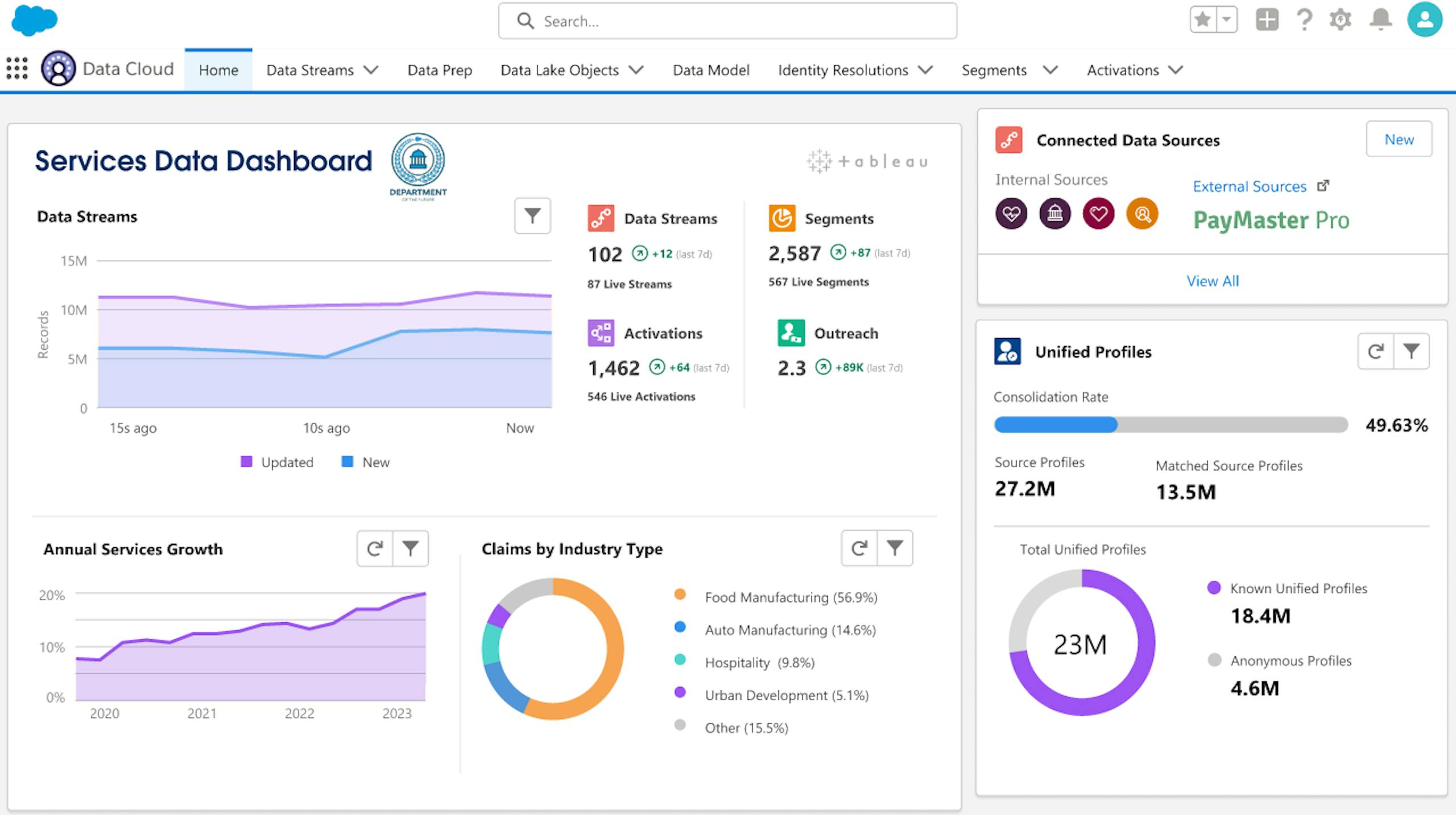 In today’s world, every organization has an abundance of data across multiple platforms and applications. Data alone is only part of the solution. Data needs to be accessible AND actionable to accomplish an organization’s goals. In order to achieve success, government organizations need to learn how to harness this data and use it to build exceptional customer or constituent experiences. Data Cloud allows organizations to connect, harmonize, and act on data captured across different sources.