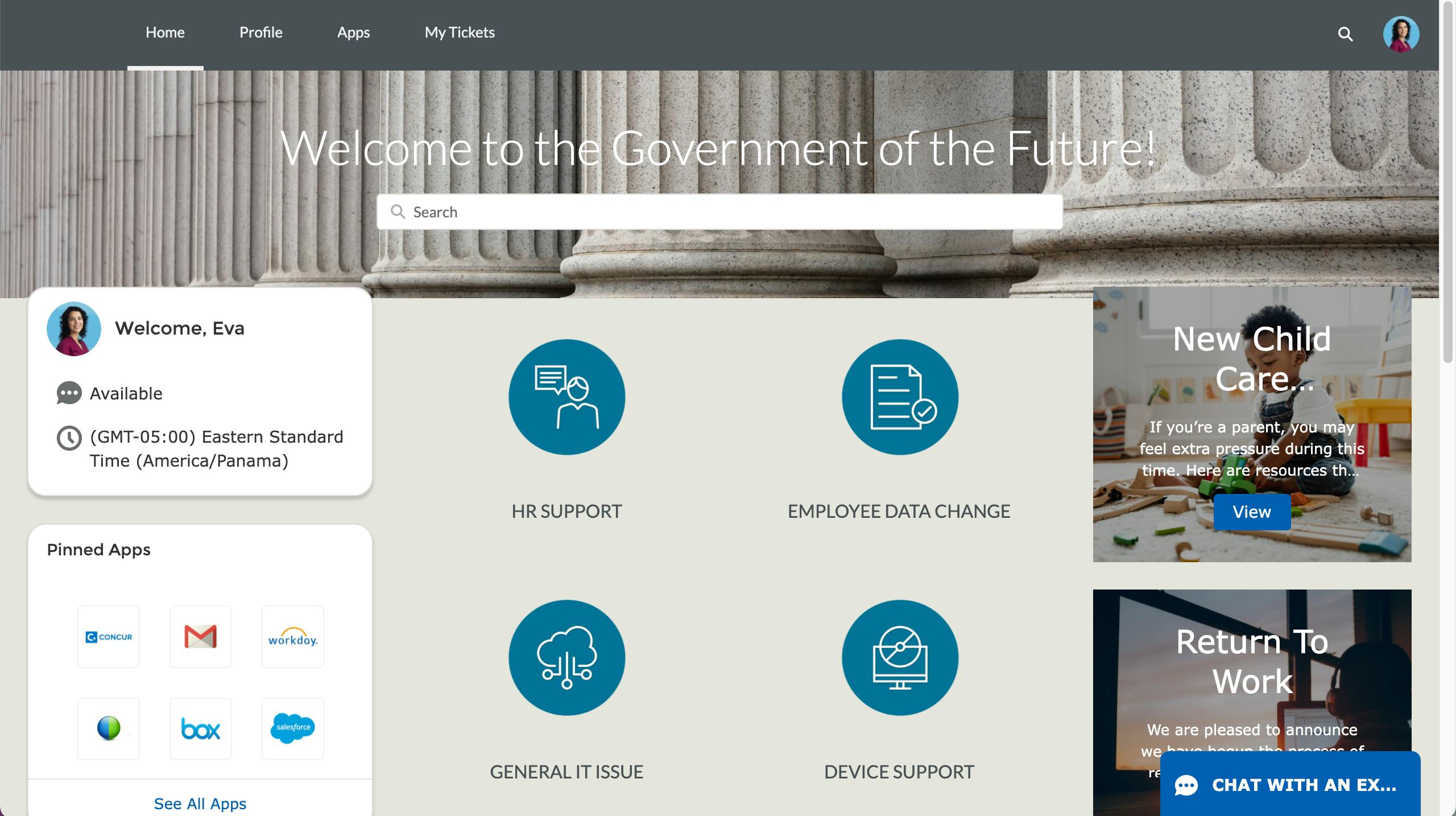 The Employee Experience for Public Sector application was inspired by and developed in response to how organizations must shift to an employee-centric experience, addressing their needs and meeting them when, where, and how they prefer to work.