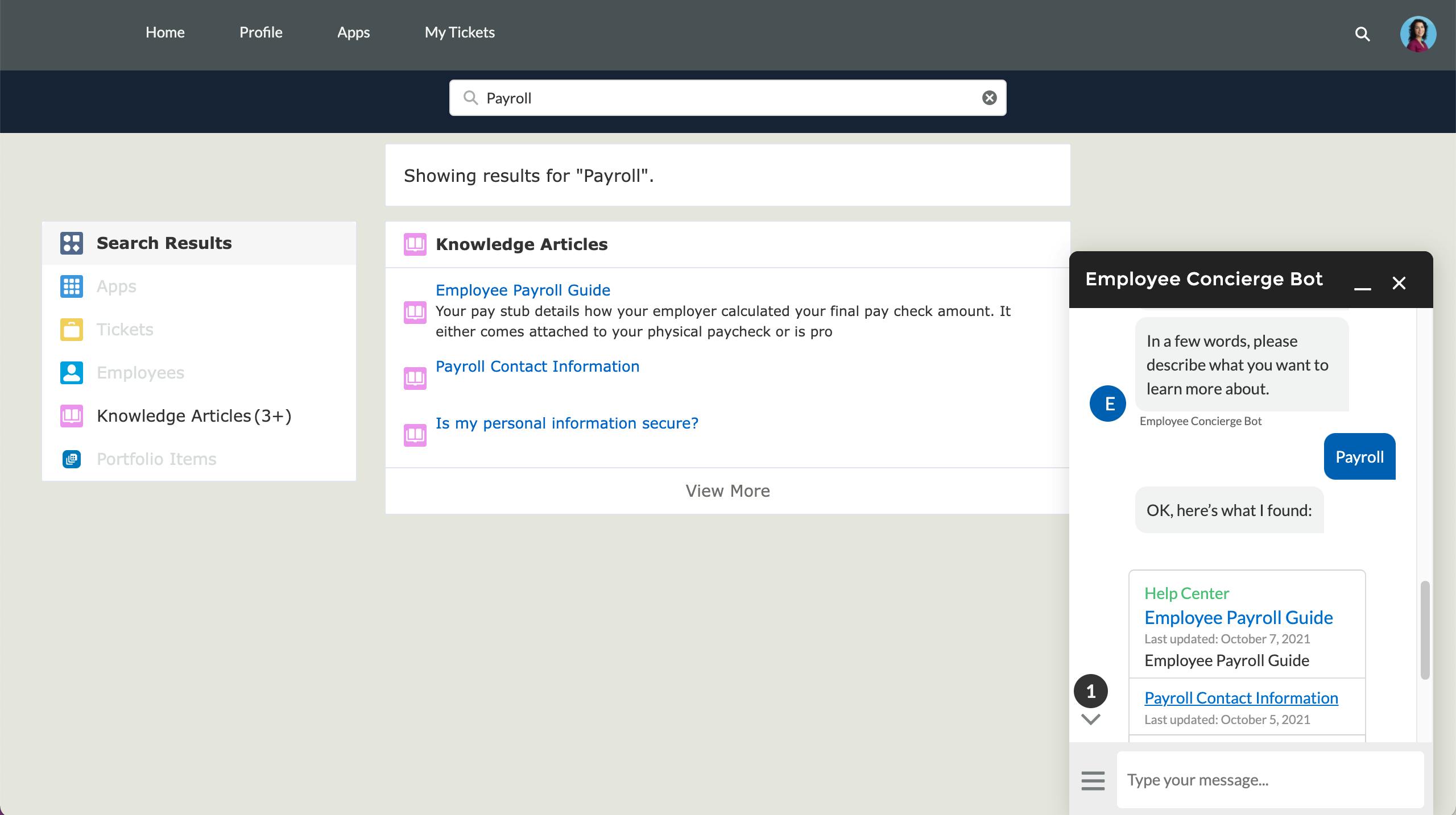 Centralize knowledge, self-service, and support channels across departments into one intelligent experience. Employees can use global search to search across all their cases and knowledge articles and interact with an Employee Concierge Bot for further information.