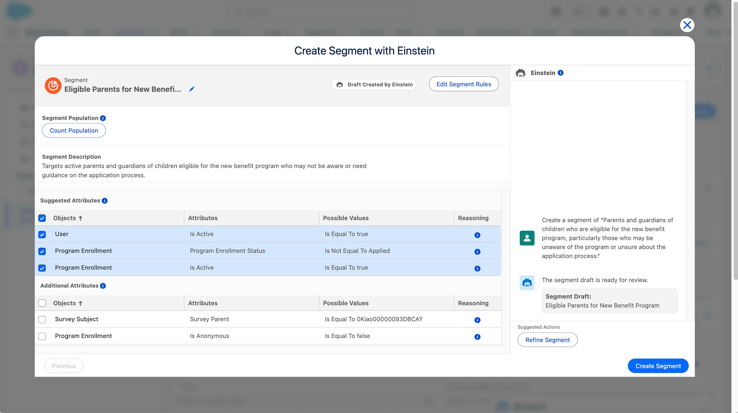 Segment Creation uses natural language prompts to help you cut through the noise of your data. But more importantly, makes it easier than ever to use the tool. All you have to do is describe what you want, and Einstein will pull the segment for you. No clicks, no code, and humans are always in the loop. This mean marketers can always adjust and tweak segments so you can rest assured that you are targeting exactly who you mean to.