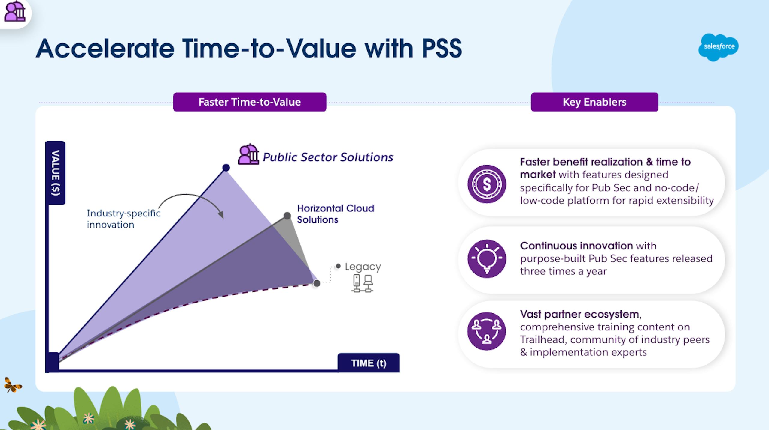 Public Sector Solutions include all the incredible innovation from Salesforce Service Cloud, Sales Cloud, and Platform. To help Public Sector organizations go even faster, Public Sector Solutions are enhanced with purpose-built innovation for the Public Sector including: public sector data models, composable public sector components, and low code/no code tools.