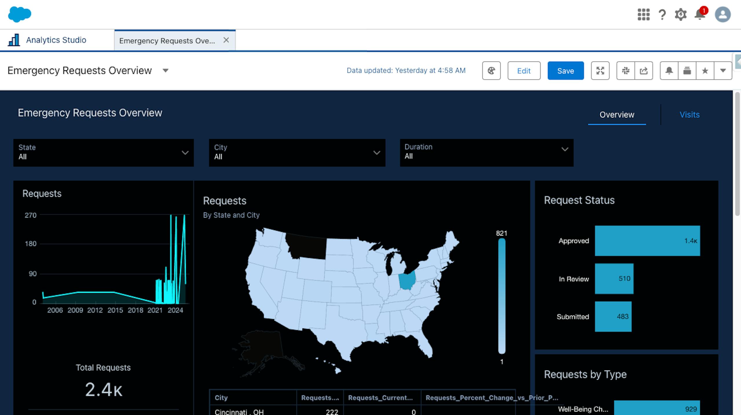 Quickly prioritize and mobilize resources in response to an emergency. Provide emergency program information, incident updates, and applications for services and aid during times of crisis. Offer your constituents a community portal where they can submit requests for emergency services. Expedite volunteer and resource deployment with automation, support team productivity with mobile-first tools, and drive greater impact with pre-built analytics.