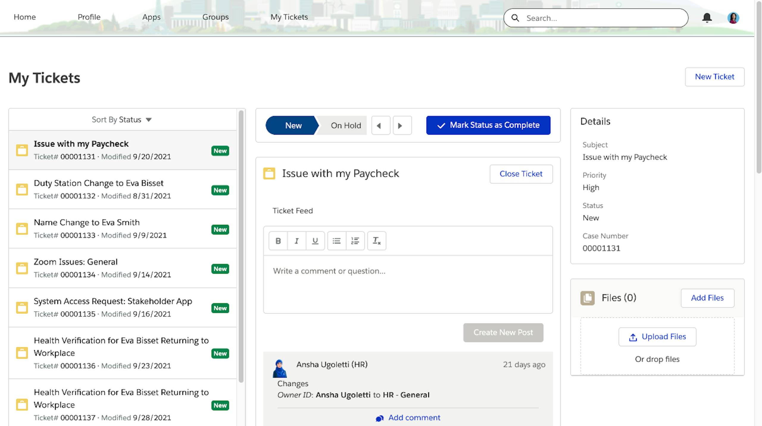 Support your employees with an operations hub to streamline administrative work. Speed up HR personnel action requests by digitizing intake forms. Expedite IT support with automated processes, workflows, and approvals. Create goal-centric support plans for employees. Administer training, coaching, or education reimbursements. Track employee relocation, retirement, or position changes—all with Employee Experience for Public Sector.
